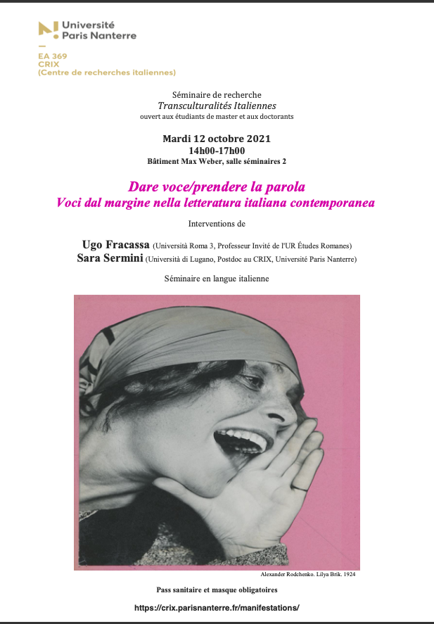 Dans le cadre du séminaire «Transculturalités italiennes», coordonné par Silvia Contarini et Christophe Mileschi, directeurs du CRIX (Centre de Recherches Italiennes). Le mardi12 octobre, séminaire Master et Doctorat consacré à : « Dare voce/prendere la parola.Voci dal margine nella letteratura italiana contemporanea».