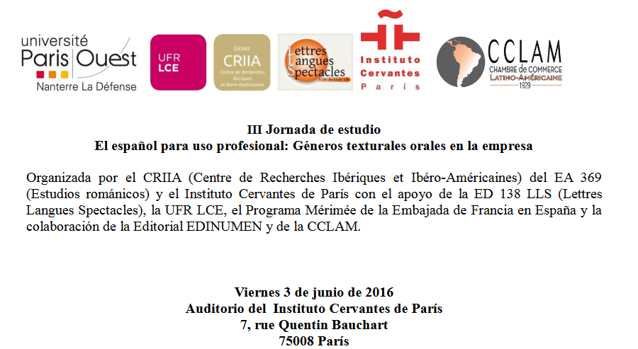 - 3ème Journée d'études " El español para uso profesional Géneros texturales orales en la empresa"3 juin 2016Organisée par le CRIIA (Centre de Recherches Ibériques et Ibéro-Américaines) de l'EA 369 Etudes Romanes, l'Insitut Cervantes de Paris avec le soutien de l'ED 138 LLS (Lettres, Langues, Spectacles), de l'UFR LCE, du Programme Mérimée de l'Ambassade de France en Espagne et avec la collaboration de l'éditeur EDINUMEN et de la CCLAM Lire la suite