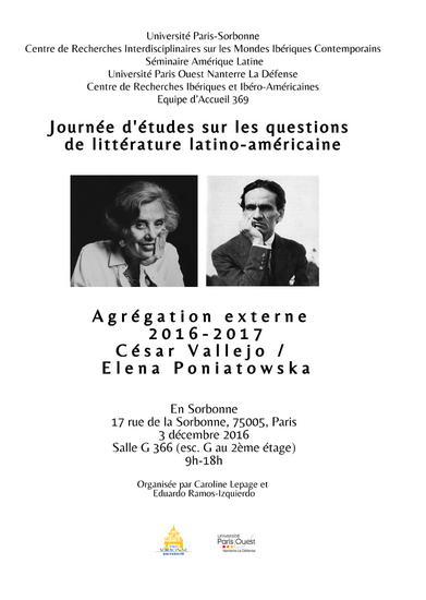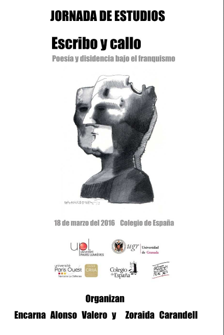 - Journée d'Études " Escribo y callo, Poesía y disidencia bajo el franquismo "18 mars 2016Journée d'Études " Escribo y callo, Poesía y disidencia bajo el franquismo " organisée par le Centre de Recherches Ibériques et Ibéro-américaines(EA Etudes Romanes) de l'Université Paris Nanterre en partenariat avec l'Université Paris 8, le Colegio de Espana, l'Université de Granada dans le cadre d'un projet soutenu par la COMUE UPL Lire la suite