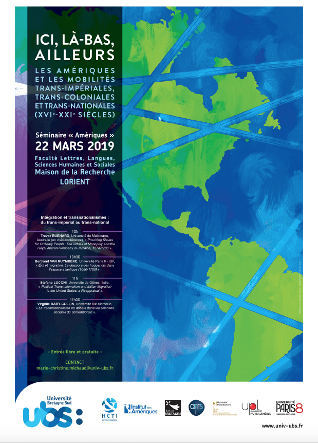 - Workshop « Intégration et transnationalismes dans les Amériques : du trans-impérial au trans-national »22 mars 2019Dans le cadre du projet de recherche "ILA" soutenu par la COMUE UPL, « Ici, là-bas, ailleurs : Les Amériques et les mobilités trans-impériales, trans-coloniales et trans-nationales (XVI-XXIe siècles) », un premier workshop à caractère théorique, intitulé « Intégration et transnationalismes dans les Amériques : du trans-impérial au trans-national », est organisé par le laboratoire HCTI Héritages et Constructions dans le Texte et l’Image (UBO) Université de Bretagne Sud, le Centre de Recherches Ibériques et Ibéro-américaines (CRIIA- EA Études Romanes) de l'Université Paris Nanterre, TransCrit EA 1569 Transferts critiques anglophones de l'Université Paris 8, avec l’appui de la Région Bretagne et de l’Institut des Amériques. Lire la suite