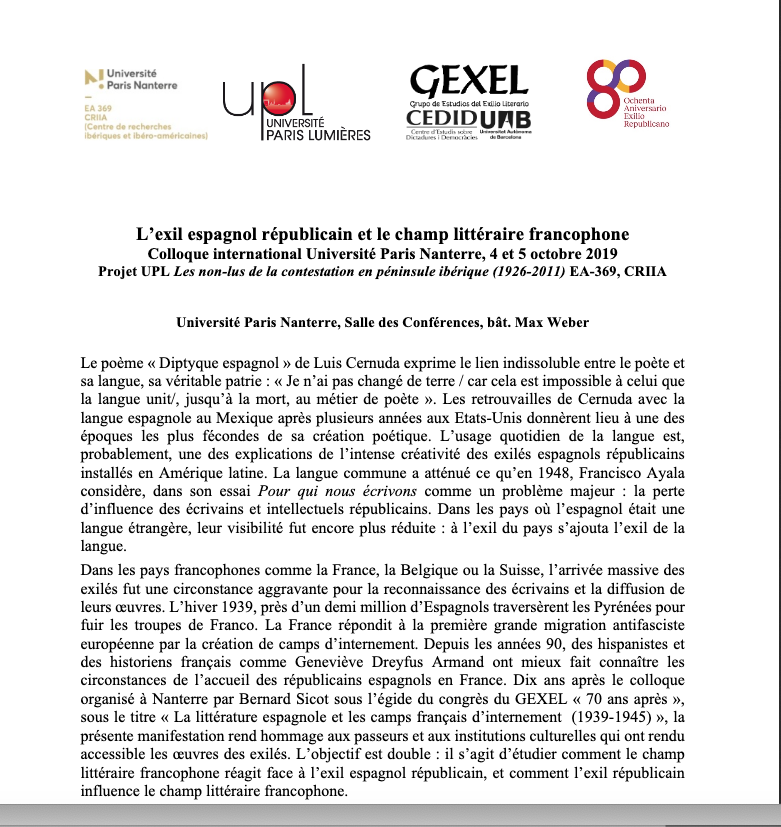 - APPEL À COMMUNICATIONS - COLLOQUE INTERNATIONAL " L’EXIL ESPAGNOL REPUBLICAIN ET LE CHAMP LITTERAIRE FRANCOPHONE "1 juin 2019Appel à communications pour le colloque international " L’exil espagnol républicain et le champ littéraire francophone ", qui aura lieu à l'Université Paris Nanterre les 04 et 05 octobre 2019. Avec le soutien du CRIIA (Centre de Recherches Ibériques et Ibéro Américaines), de l'EA Etudes Romanes et du projet le COMUE UPL "Les non-lus de la contestation en péninsule ibérique (1926-2011)". Le présent Congrès reçoit également l’appui du CERMI (Centre d’Etudes et de Recherches sur les Migrations Ibériques) Lire la suite
