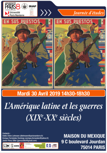 - Journée d'études " L'Amérique Latine et les guerres (XIXe-XXe siècles) "30 avril 2019Journée d'études consacrée à " L'Amérique latine et les guerres (XIXe-XXe siècles) " organisée par le CRIIA-EA Etudes Romanes de l'Université Paris Nanterre, le Laboratoire d'Etudes Romanes de l'Université Paris 8, la Casa de Mexico et de nombreux partenaires Lire la suite