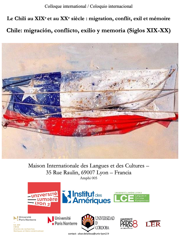 - Colloque international " Le Chili au XIXe et au XXe siècle : migration, conflit, exil et mémoire "6 juin 2019 - 7 juin 2019Colloque international organisé par l'Université Lumière - Lyon 2 en collaboration avec le Centre de Recherches Ibériques et Ibéro-américaines (CRIIA- EA Études Romanes) de l'Université Paris Nanterre, le laboratoire d’Études Romanes (LER- EA4385) de l'Université Paris 8, l'Université de Cordoba et avec le soutien de l'Institut des Amériques. Il porte sur : " Le Chili au XIXe et au XXe siècle : migration, conflit, exil et mémoire " Lire la suite