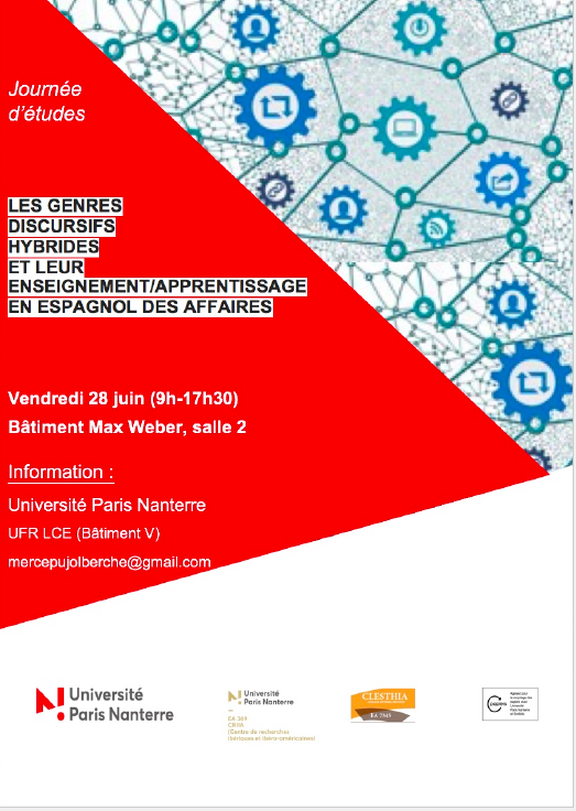 - Journée d'études " LES GENRES DISCURSIFS HYBRIDES ET LEUR ENSEIGNEMENT/APPRENTISSAGE EN ESPAGNOL DES AFFAIRES "28 juin 2019Journée d'études co-organisée par le Centre de Recherches Ibériques et Ibéro-américaines (CRIIA- EA Etudes Romanes) de l’Université Paris Nanterre et par l'EA CLESTHIA (Langage, systèmes, discours) de l’Université Sorbonne Nouvelle - Paris 3, avec le soutien de la commission recherche et de l’UFR LCE de l’Université Paris Nanterre. Lire la suite