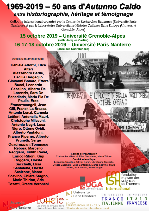 - Colloque international : " 1969-2019 : 50 ans d’Autunno caldo entre historiographie, héritage et témoignage "15 octobre 2019 - 18 octobre 2019Colloque international organisé par le Laboratoire Universitaire Histoire Cultures Italie Europe (LUHCIE) de l'Université Grenoble Alpes et le Centre de Recherches Italiennes (CRIX- EA Etudes Romanes) de l'Université Paris Nanterre avec le soutien de l'Université Grenoble Alpes, de la commission Recherche de l'Université Paris Nanterre, de l'Université Franco-Italienne et de la Fondation Maison des Sciences de l'Homme Lire la suite
