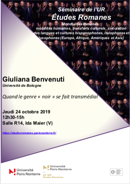 - Séminaire transversal de l'UR Etudes Romanes : "Quand le genre "noir" se fait transmédial"24 octobre 2019Nouvelle séance du séminaire de l'UR Etudes Romanes autour des mondialités romanes : mobilités humaines, transferts culturels, circulation des langues et cultures hispanophones, italonophones et lusophones en Europe, Afrique, Amériques et Asie. Giuliana Benvenuti animera la séance Lire la suite