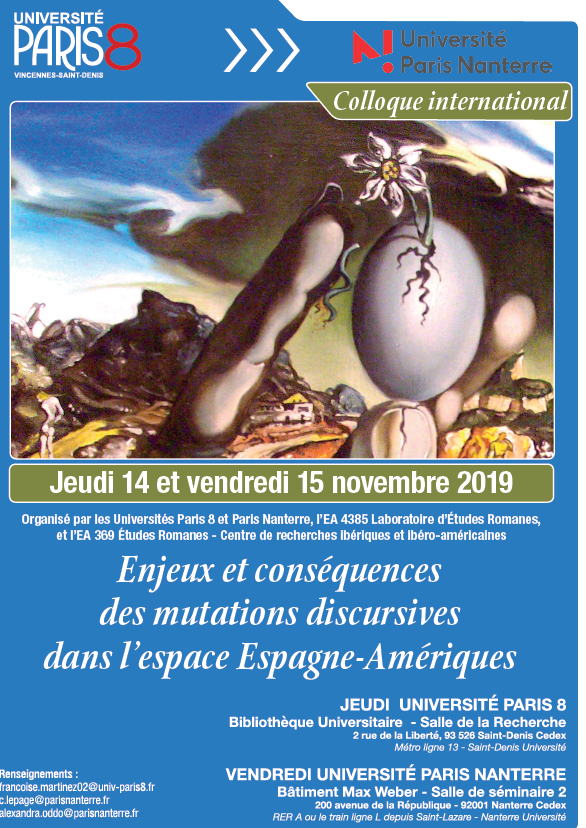 - Colloque international : "Enjeux et conséquences des mutations discursives dans l'espace Espagne-Amériques"14 novembre 2019 - 15 novembre 2019Ce colloque international est organisé par les Universités Paris 8 et Paris Nanterre ; le Laboratoire d'Etudes Romanes (EA LER), et par le Centre de recherches ibériques et ibéro-américaines (CRIIA-EA Etudes Romanes). Il sera consacré aux enjeux et conséquences des mutations discursives dans l'espace Espagne-Amériques. Lire la suite