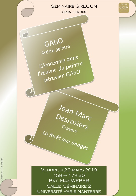 - Séminaire du GRECUN "Représentations visuelles contemporaines de l'Amazonie"29 mars 2019Le groupe Grecun, rattaché au CRIIA (Centre de recherches ibériques et ibéro-américaines) - EA Etudes Romanes organise un séminaire autour des œuvres des artistes Gabo et Jean-Marc Desroziers. Lire la suite