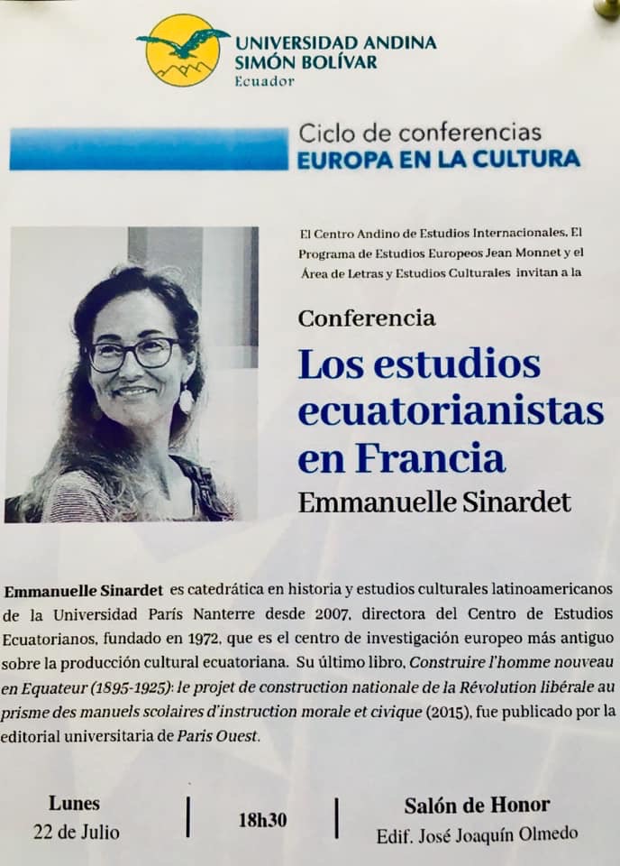 - Conférence : " Les études équatoriennes en France "22 juillet 2019Le Centre d'études équatoriennes, groupe du Centre de recherches ibériques et ibéro-américaines (CRIIA - EA Etudes Romanes) de l'Université Paris Nanterre, organise une conférence sur " Les études équatoriennes en France " à l’Université Andine Simon Bolivar en Equateur Lire la suite