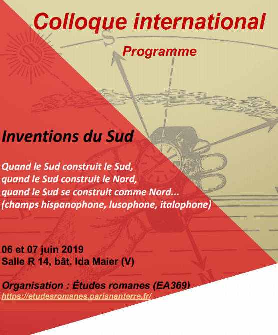 - Colloque international : " Inventions du Sud "6 juin 2019 - 7 juin 2019Colloque international organisé par l'EA Études Romanes et les trois équipes CRIIA, CRILUS, CRIX avec le soutien de l'UFR LCE et de la Commission Recherche de l'Université Paris Nanterre. Il porte sur les "inventions du Sud" ; Quand le Sud construit le Sud, quand le Sud construit le Nord, quand le Sud se construit comme Nord... dans les champs hispanophone, lusophone et italophone. Lire la suite