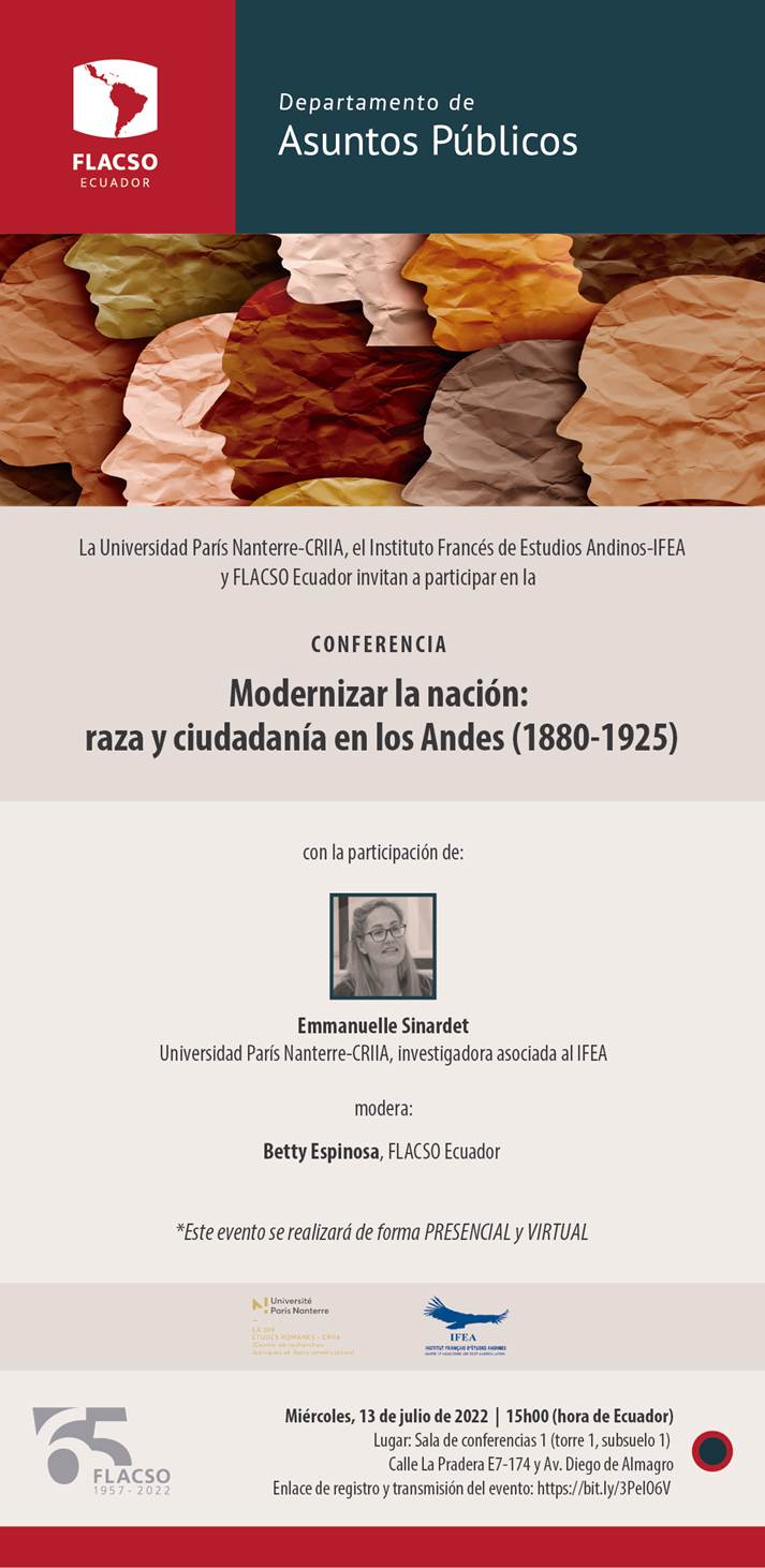 Emmanuelle Sinardet (UR Études romanes – CRIIA – CEE) donnera une conférence sur « Modernizar la nación: raza y ciudadanía en los Andes (1880-1925) » à la FLACSO-Sede Ecuador Quito