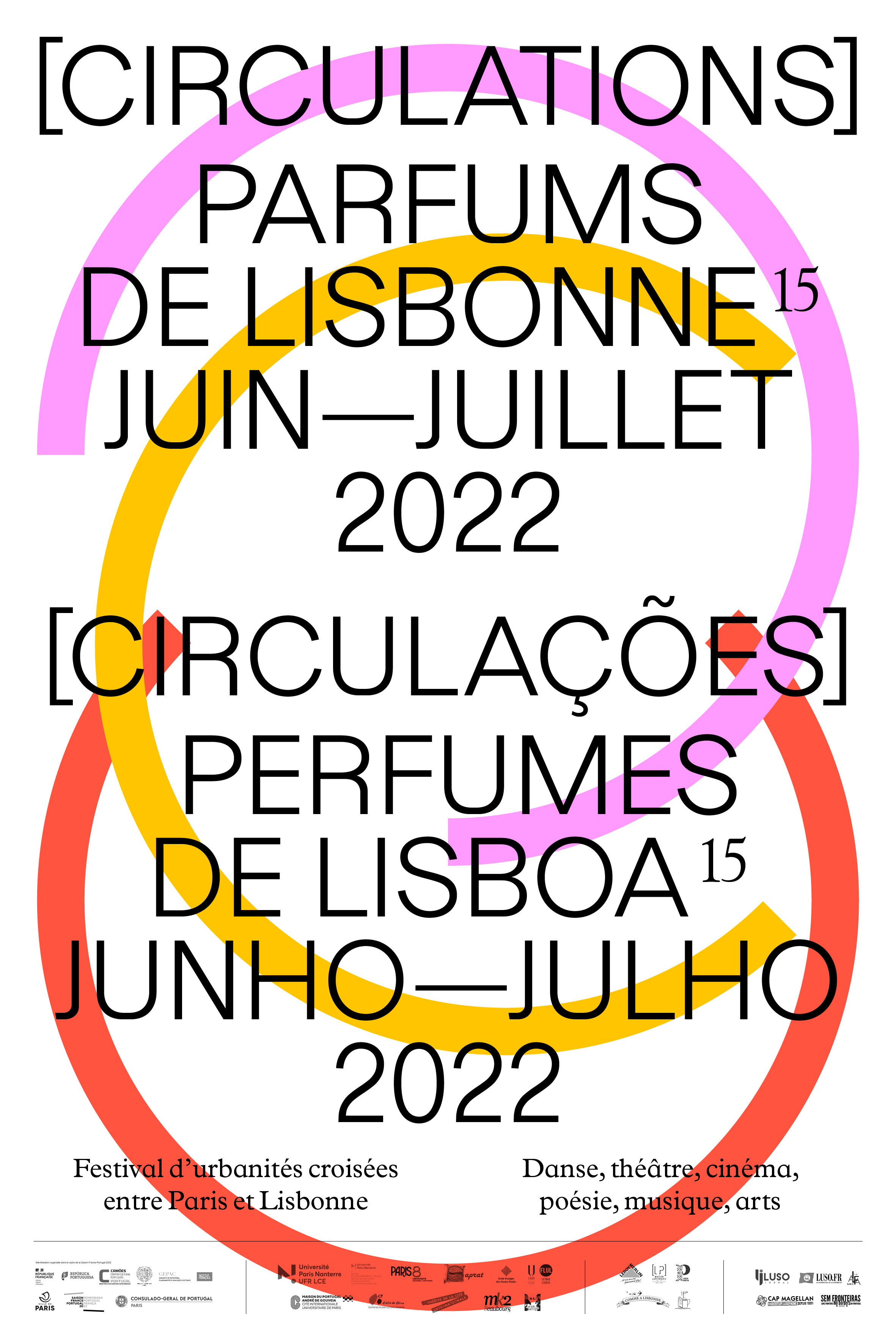 Le thème de la 15e édition des Parfums, Circulations / Circulações, vient souligner la spécificité d’un événement à l’horizon ouvert et défini autour du dialogue entre les cultures, un festival d’urbanités croisées entre deux capitales européennes qui n’ont de cesse de développer des échanges féconds. Les circulations s’opèrent dans l’espace, entre les lieux, la pluridisciplinarité des séances proposées, afin de permettre la rencontre entre des publics diversifiés, au croisement des imaginaires, des langues et des êtres.