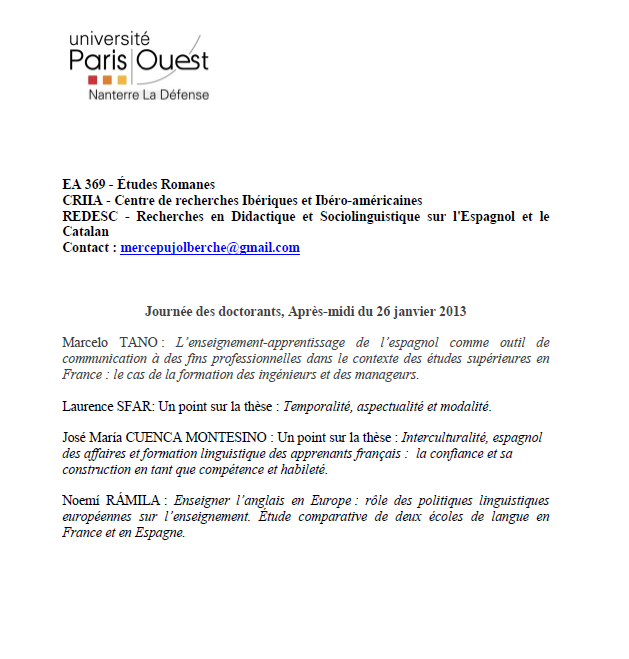 La journée des doctorants du REDESC (Recherches en Didactique et Socioloinguistique sur l'espagnol et le catalan) au sein du CRIIIA (Centre de recherches ibériques et ibéro-américaines) de l'EA Etudes Romanes aura lieu le 26 janvier 2013.