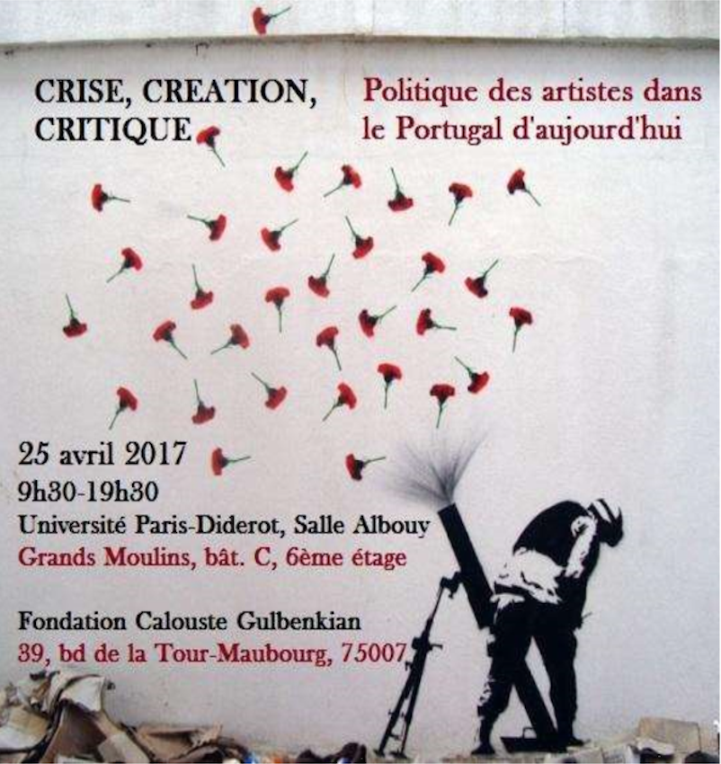 Organisée par le CRILUS (Centre de Recherches interdisciplinaires sur le monde LUSophone) - EA 369 Études Romanes, le CERILAC - Université Paris-Diderot et la Maison du Portugal - Université Paris 8, cette journée d'étude porte sur le thème "Crise, création, critique. Politique des artistes dans le Portugal d'aujourd'hui" (Arts du spectacle, cinéma, littérature)