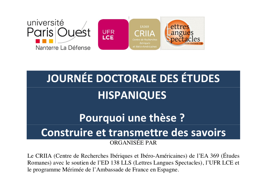 JOURNÉE DOCTORALE DES ÉTUDES HISPANIQUES : Pourquoi une thèse? Construire et transmettre des savoirs" organisée par Le CRIIA (Centre de Recherches Ibériques et Ibéro-Américaines) de l’EA 369 (Études Romanes) avec le soutien de l’ED 138 LLS (Lettres Langues Spectacles), l’UFR LCE et le programme Mérimée de l’Ambassade de France en Espagne
